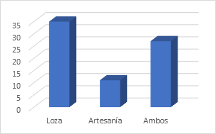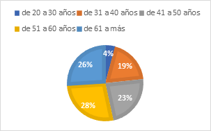 El mayor porcentaje que participó en el estudio fueron personas adultas entre 51 a 60 años con 28%, siguiendo un 26% con personas de 61 años en adelante, luego 23% con artesanos entre 41 a 50 años, 19% de 31 a 40 años y finalizando con el 4% representando entre 20 a 30 años. Mostrando segmentos etarios distribuidos progresivamente a partir de los 31 años en adelante, los mayores segmentos son los de artesanos de más edad, no obstante, se evidencia que existe relevo generacional.