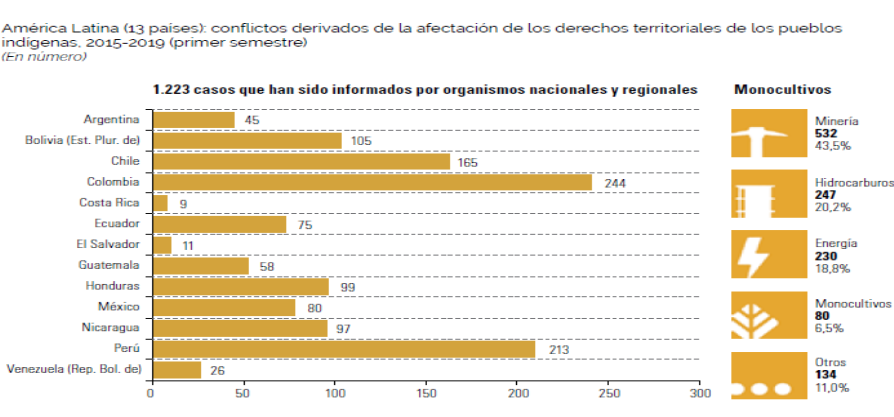 Muestra del papel que han jugado las tierras en la historia de los pueblos originarios, son los datos presentados por la Comisión Económica para América Latina y el Caribe (CEPAL), en documento elaborado por Lorena Arce y José Aylwin (2018) respecto a la situación de las tierras habitadas por poblaciones indígenas en América Latina, evidenciando el alto número de conflictos originados por la posesión de la tierra, tal como se muestra en el gráfico a continuación.