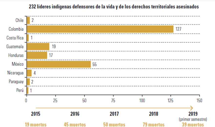 En los conflictos reportados, se ha dado incluso gran cantidad de líderes indígenas asesinados en diferentes países, como se ilustra en el gráfico 2.